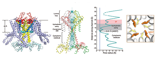 RyR1跨膜粒子通道区的三维结构模型。