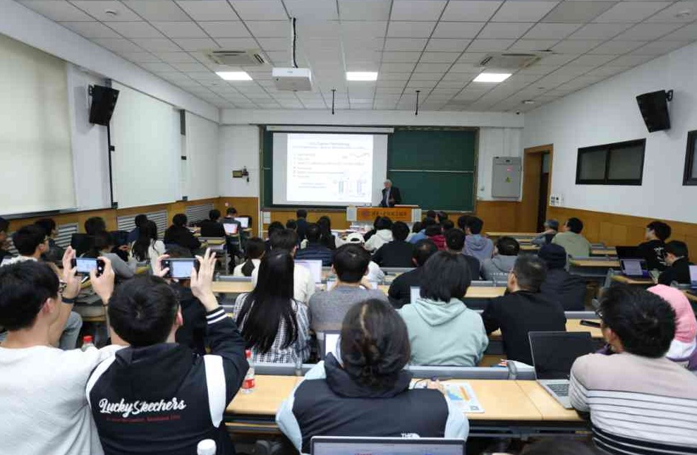 化工系、国际处相关负责人参加活动。来自化工系等院系的百余名师生现场聆听演讲。