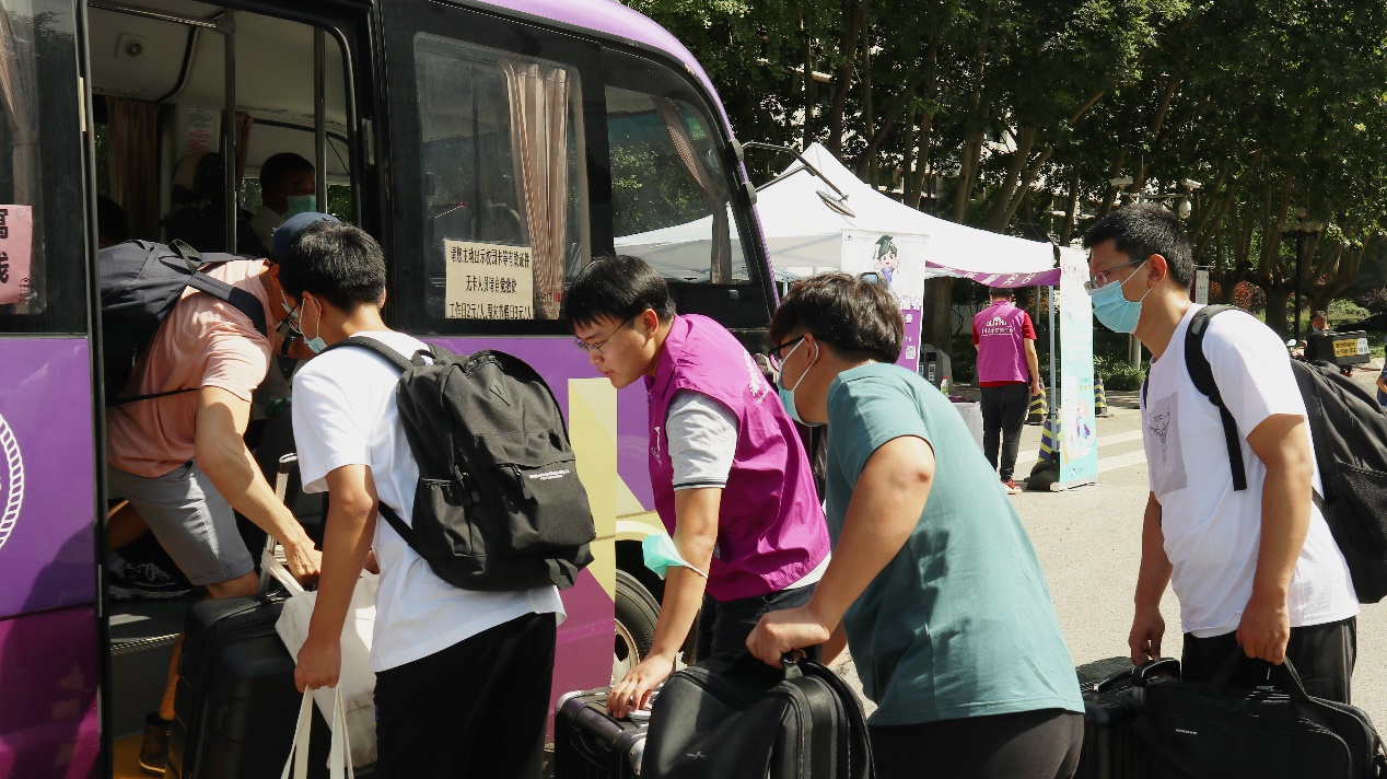 志愿者引导新生同学乘坐迎新专线