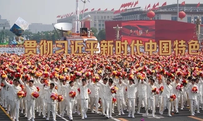 10月1日,3514名清华师生组成「伟大复兴」方阵走过天安门。负责「贯彻习近平新时代中国特色社会主义思想」标语的,就是刘知远所在的第18方阵标语车中队。中队37名队员有着推动标语车的光荣,但不管从哪个角度,照片都拍不到他们的脸。有一名队员在朋友圈中这样调侃自己:「我在『中』和『国』之间」。