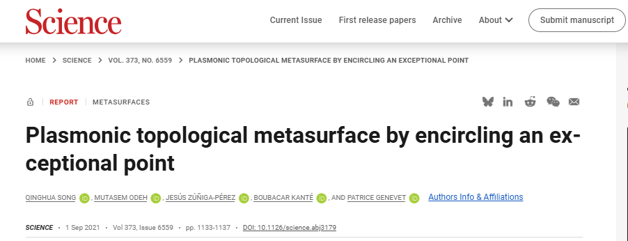 宋清华团队长期致力于电磁超构表面、光子晶体等微纳光学领域的研究。在法国国家科研中心从事博士后工作期间,宋清华就提出了一种全新的相位调控方法,研究了非厄密超构表面的拓扑性质,探讨了其受拓扑保护的360度相位实现方法。研究结果表明,通过设计非厄密拓扑超构表面,可以产生一个奇异点。奇异点在光学当中也是一种“龙卷风”的“风眼”,围绕这个“风眼”一圈,光的相位可以产生360度的累积。而且这种360度相位累积受该“风眼”拓扑保护,与所围绕的路径无关。这一研究成果后来发表在《科学》(Science)杂志上。